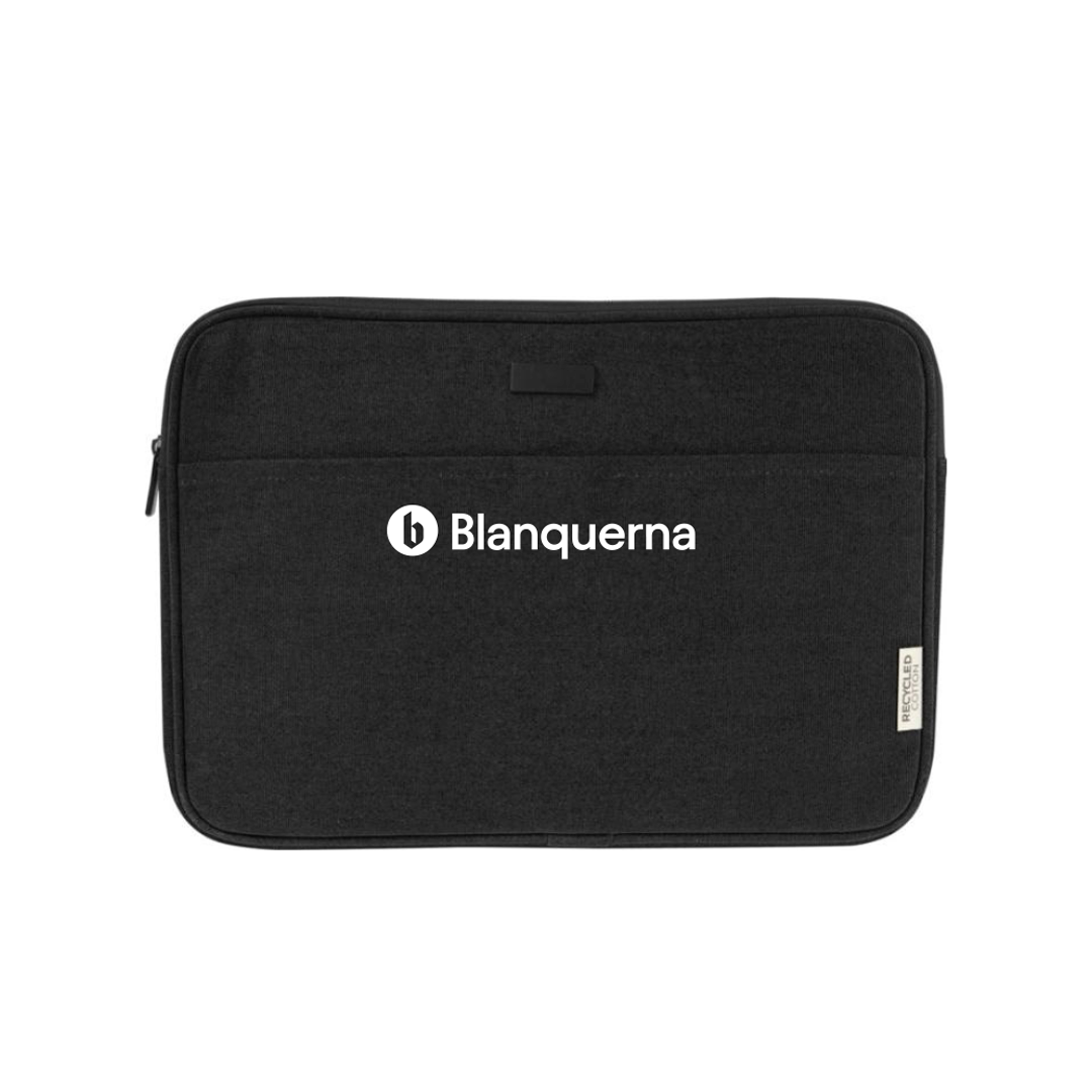 Funda para portátil de 14″ marcada con logo blanco. Se compone de materiales altamente duraderos y sostenibles, lona reciclada GRS y forro GRS RPET, tiene un compartimento protegido para portátil y un bolsillo delantero abierto con cierre auto adherente.